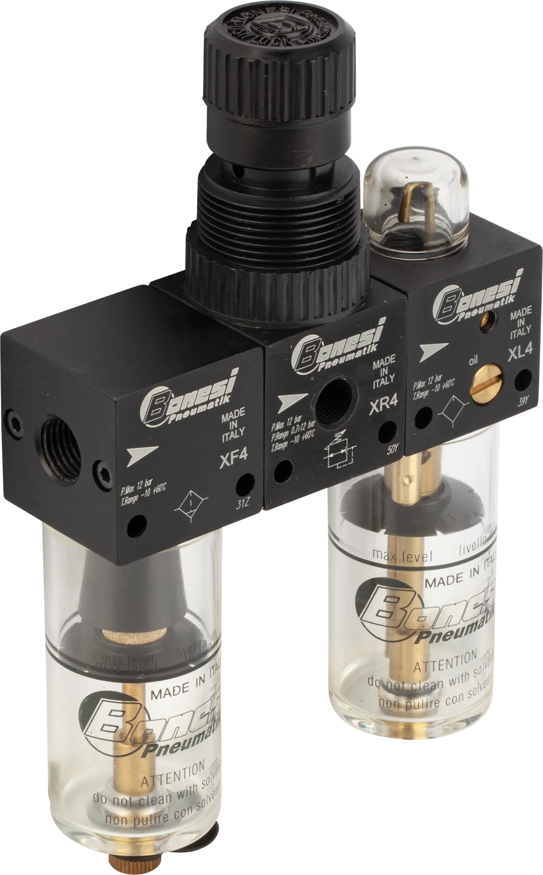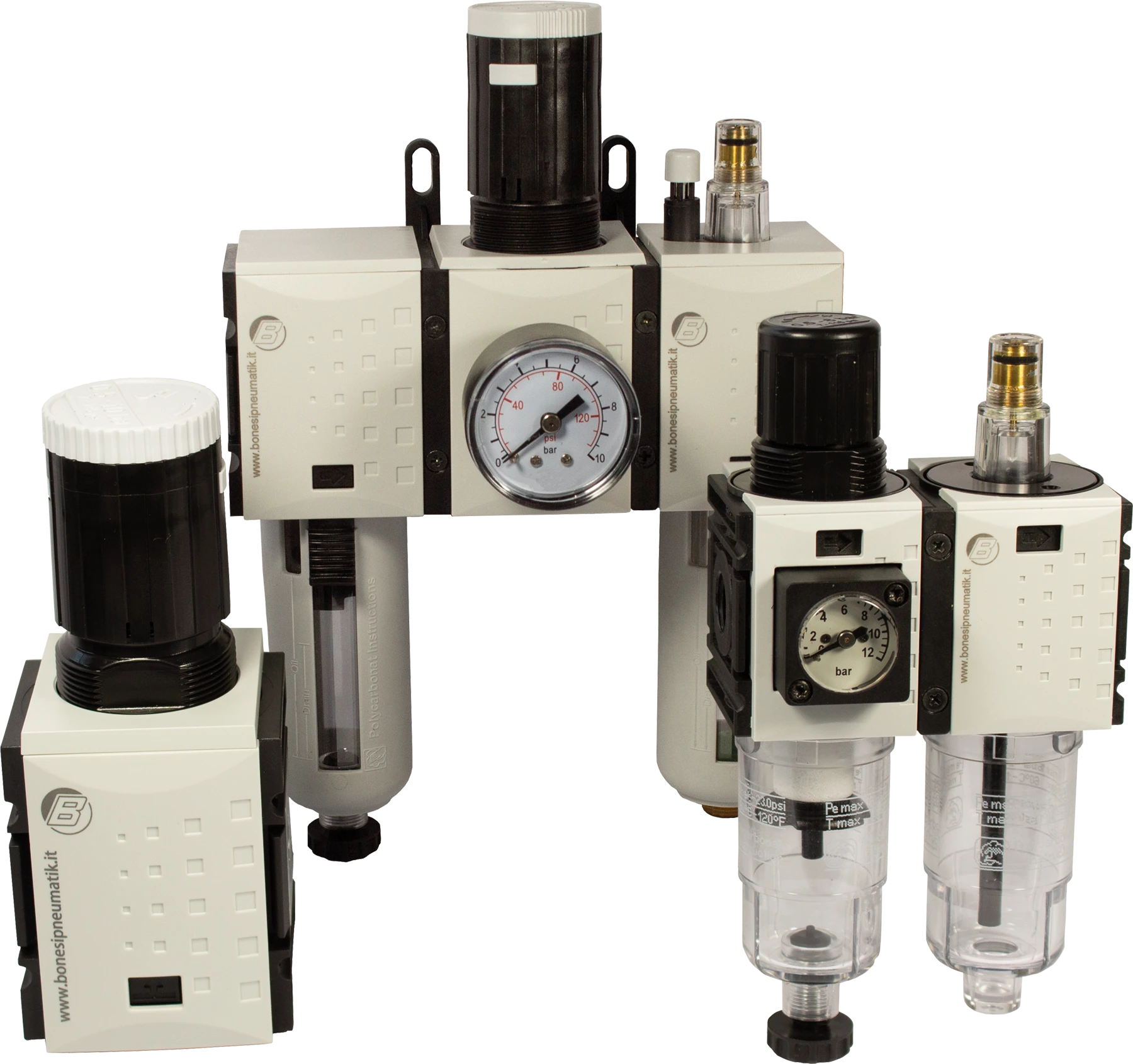 I gruppi di trattamento e preparazione dell’aria di Bonesi Pneumatik sono realizzati in tre serie e sono disponibili sia con corpi realizzati in metallo sia con corpi realizzati in tecnopolimero/metallo.